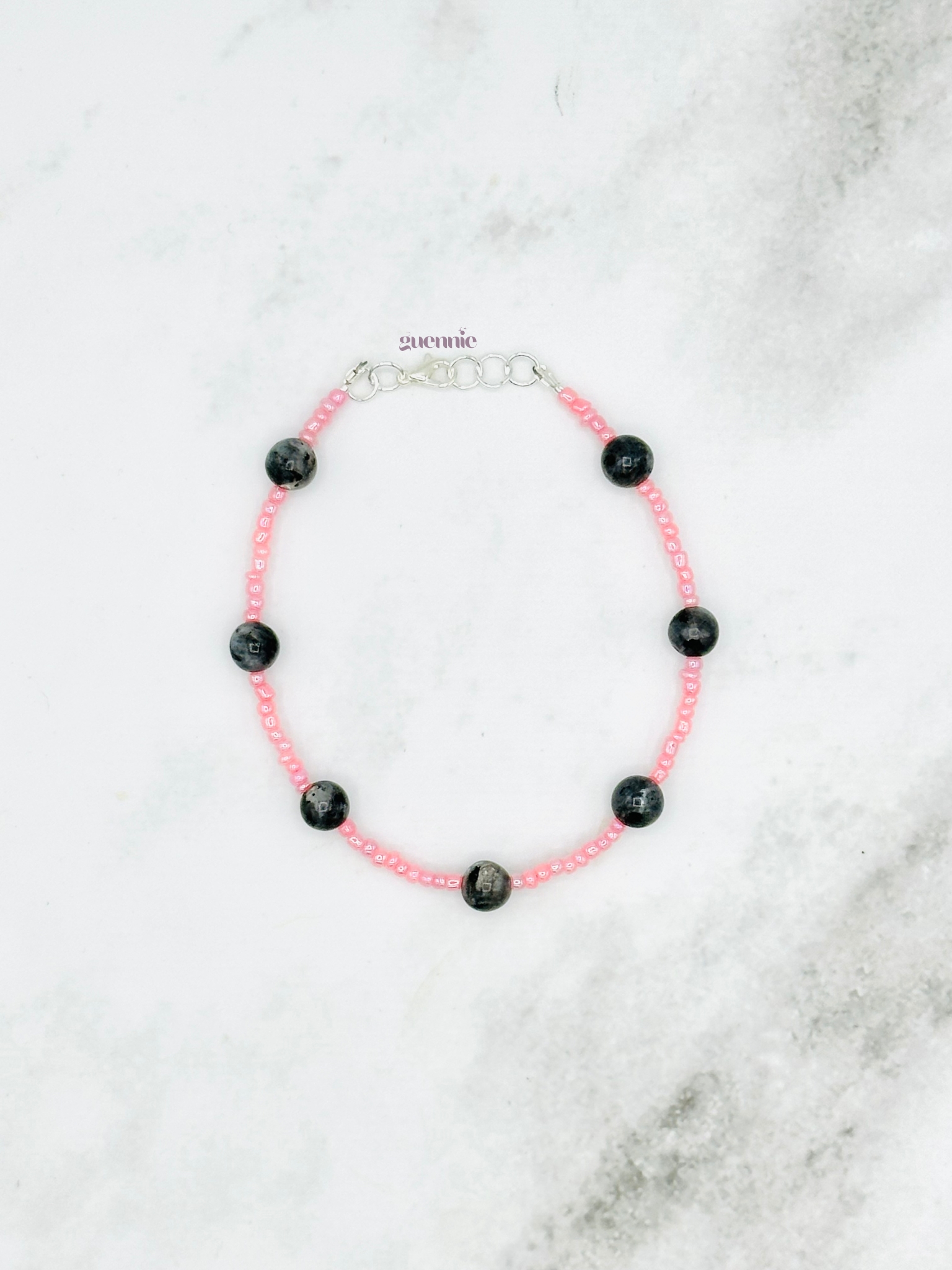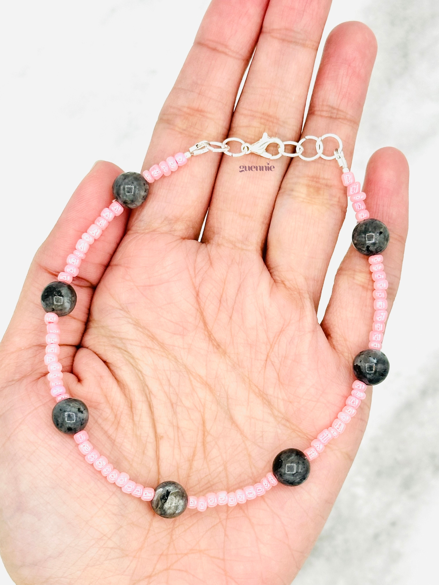 Pink Seed Beads & Black Labradorite Beaded Anklet