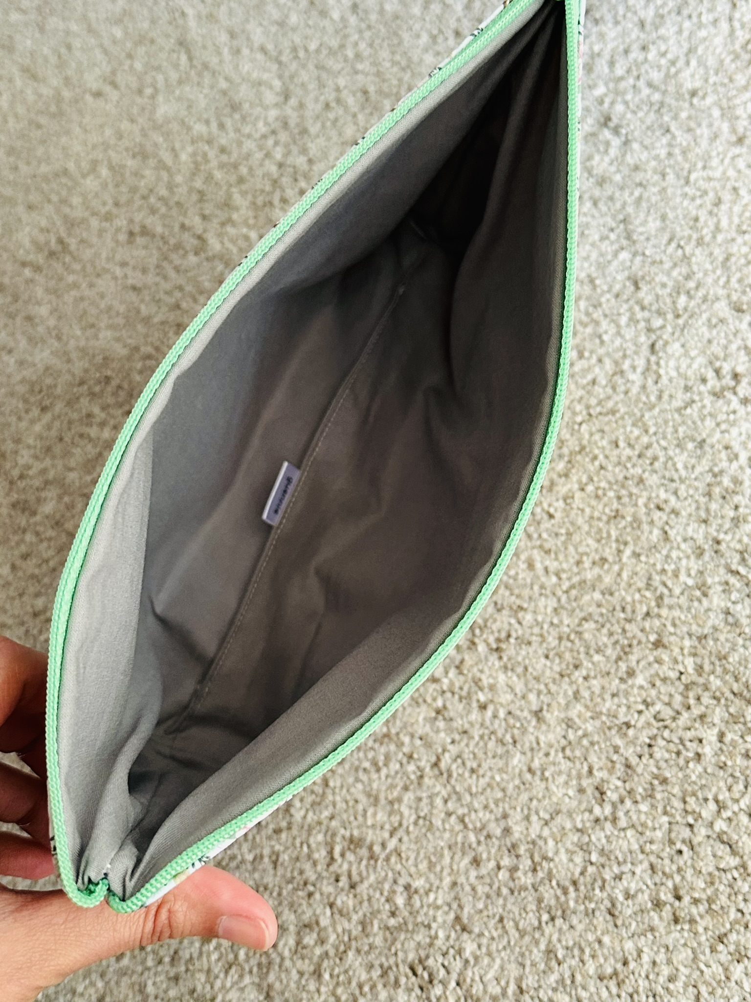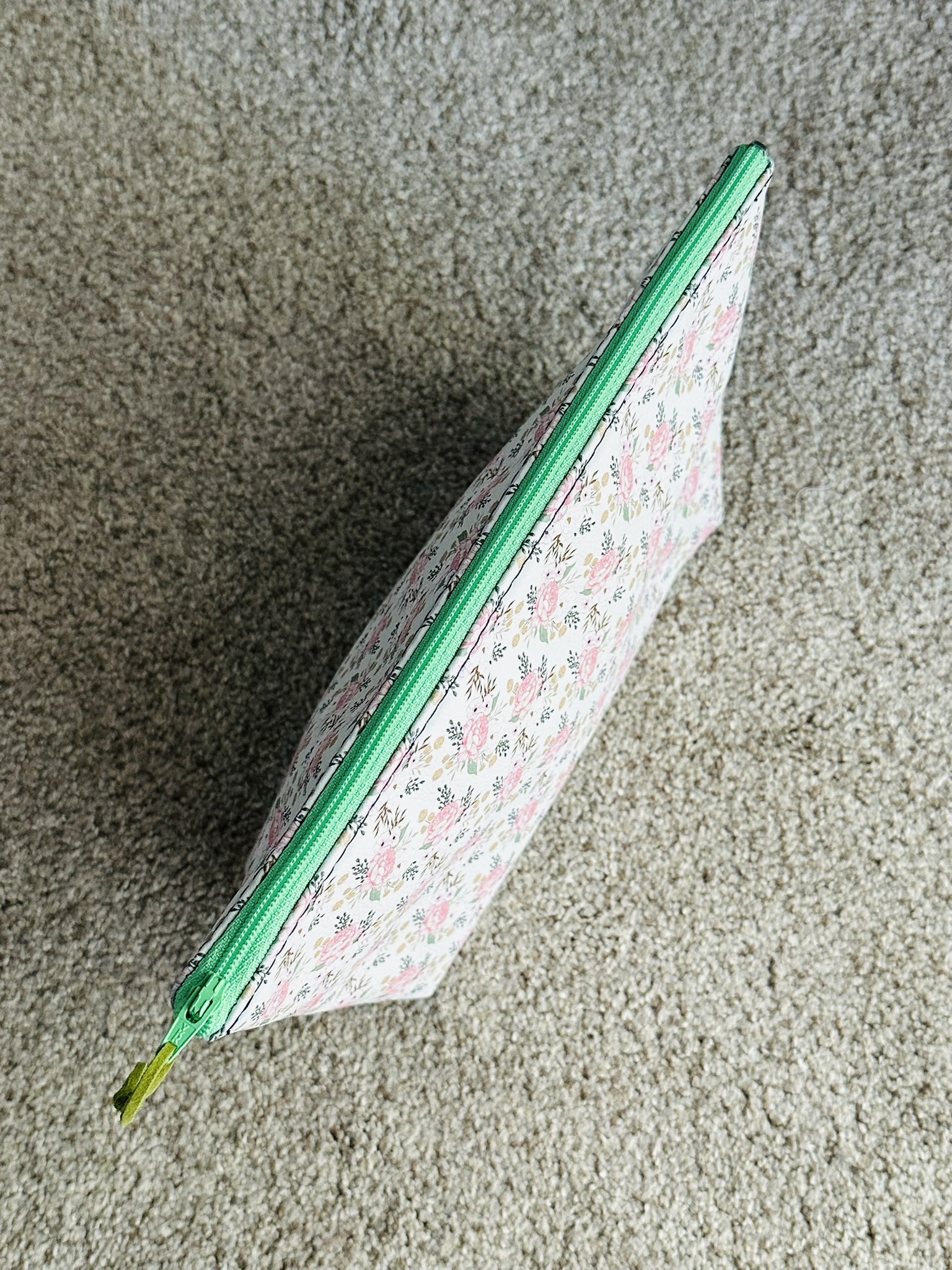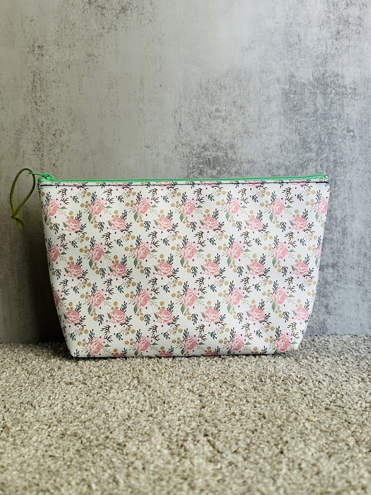 A playful blend of style and function. Made with floral-printed vegan leather, lined with soft cotton, and finished with a colorful zipper for a cheerful touch. Use it as a makeup bag, travel organizer, clutch, or everyday catch-all. Measures approx. 10″ wide at the top, 7.5″ at the bottom, 3″ deep, and 6″ tall.