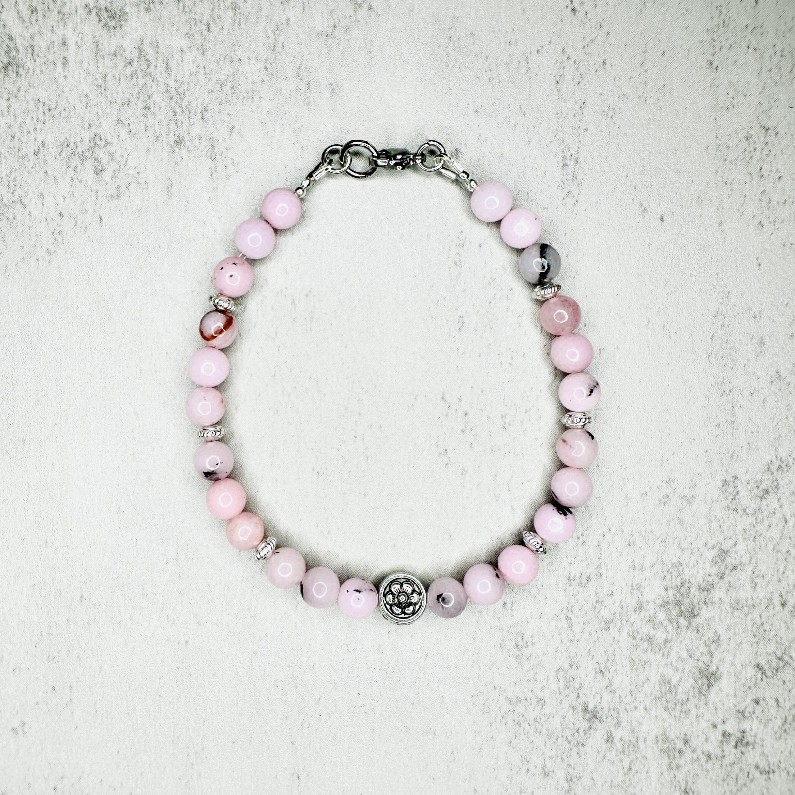 Materials: cherry blossom jasper gemstone beads, metal beads, stainless steel lobster claw clasp, bar charm
