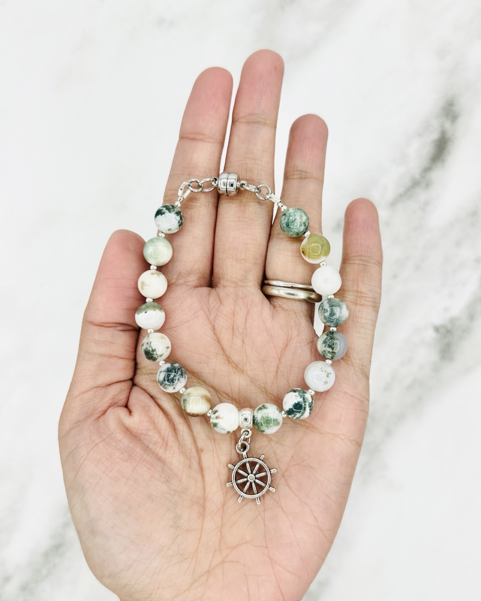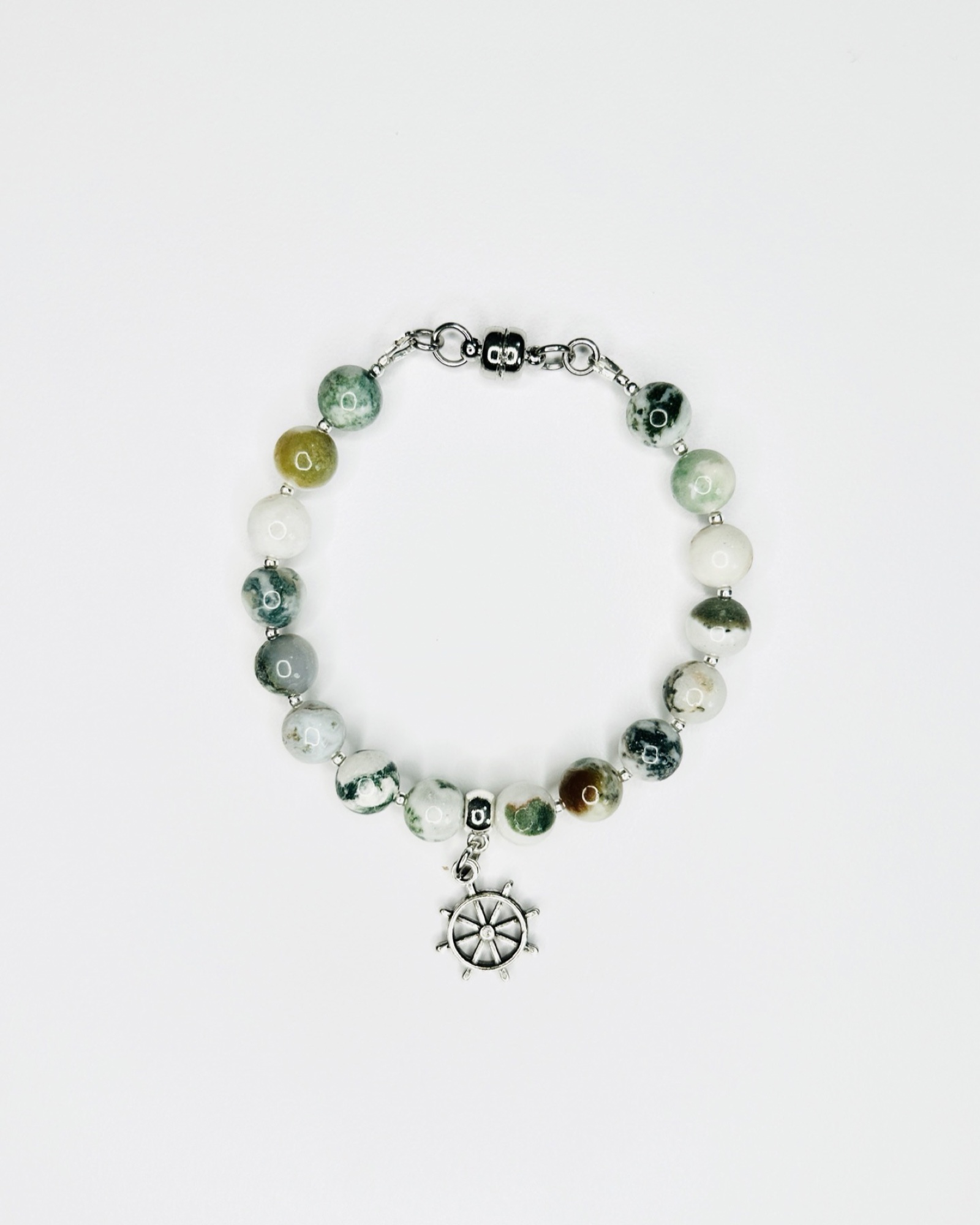Materials: 8mm gemstone beads, metal beads, silver ship wheel charm, metal magnetic clasp closure