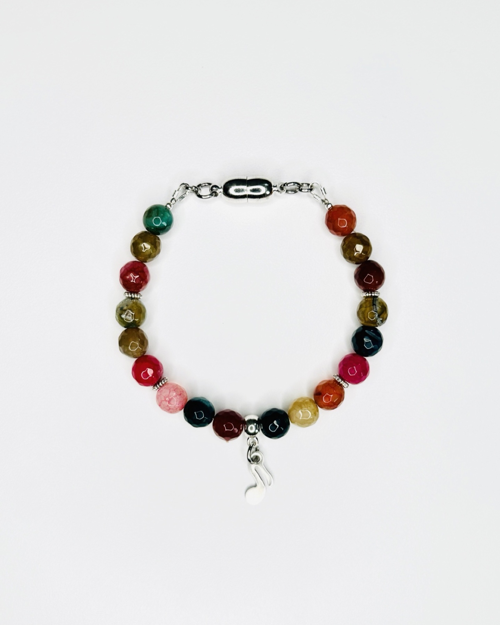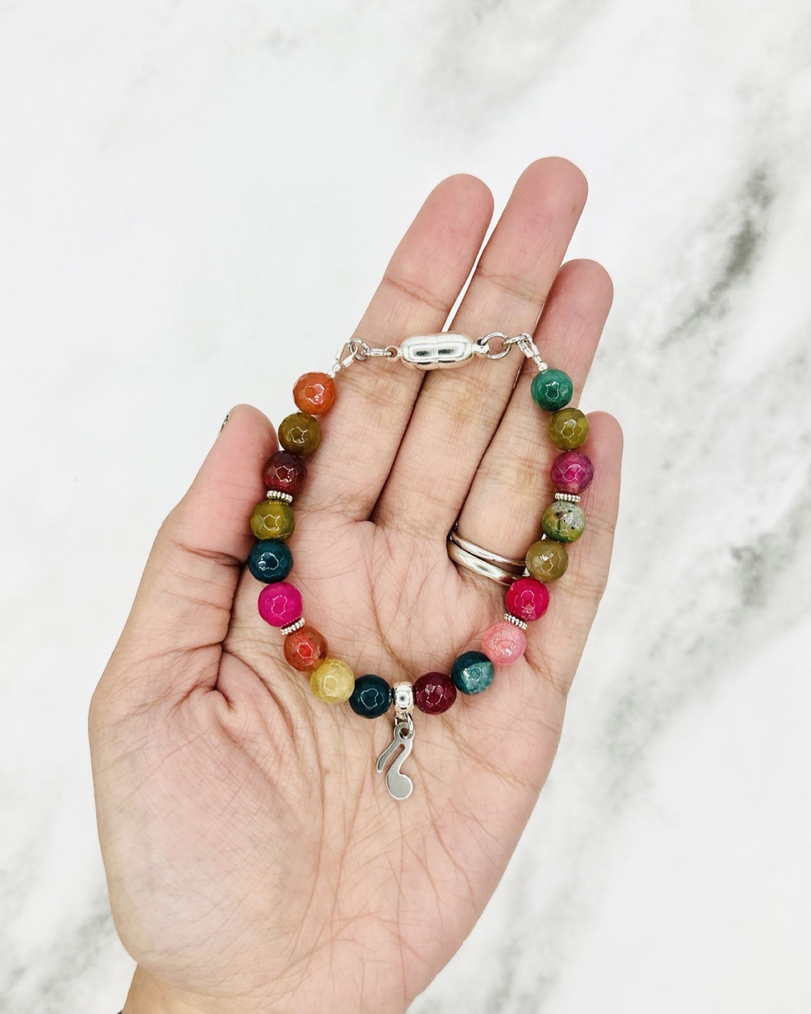 Materials: 8mm gemstone beads, metal beads, stainless steel music note charm, metal magnetic clasp closure