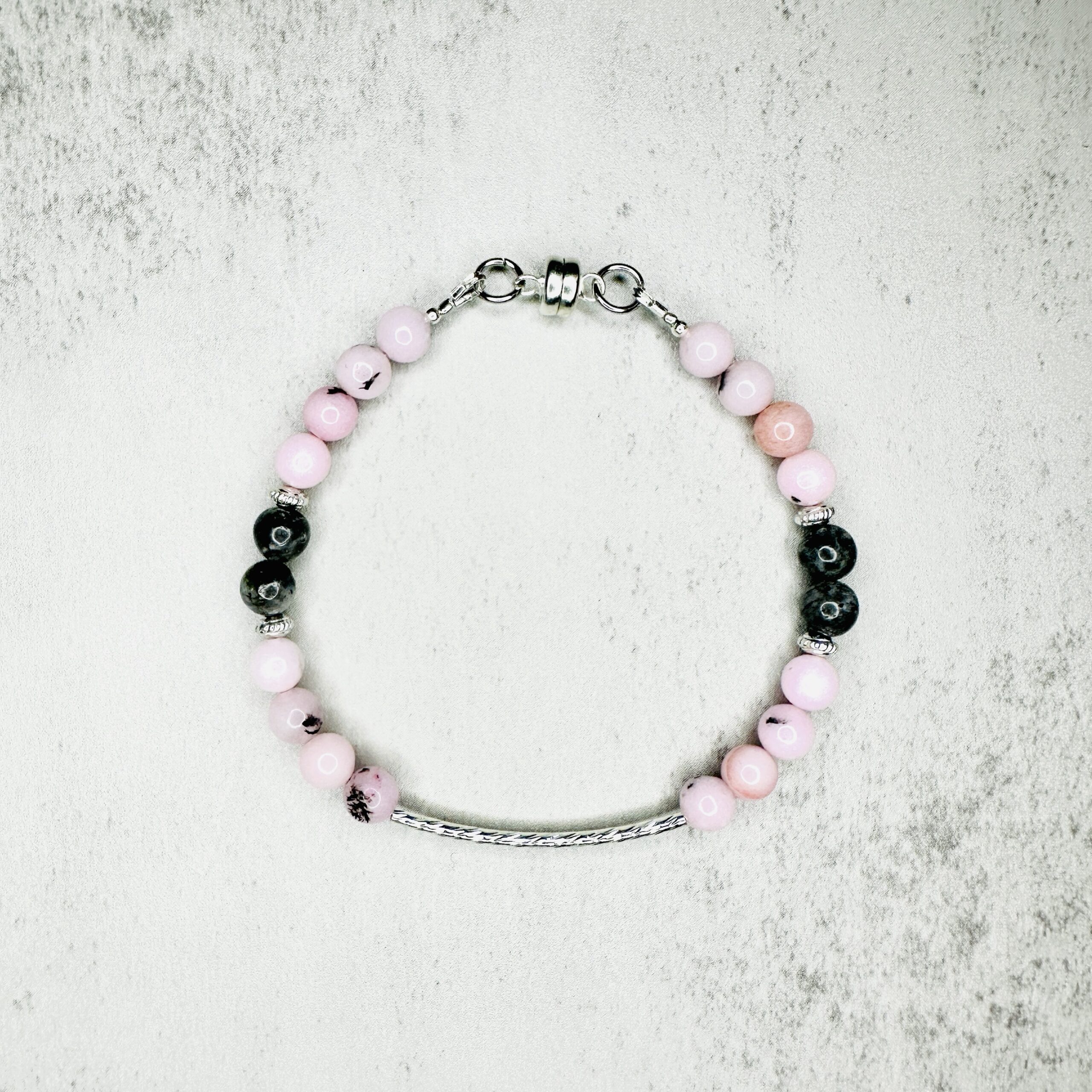 Materials: cherry blossom jasper & labradorite gemstone beads, metal beads, metal magnetic clasp closure, bar charm