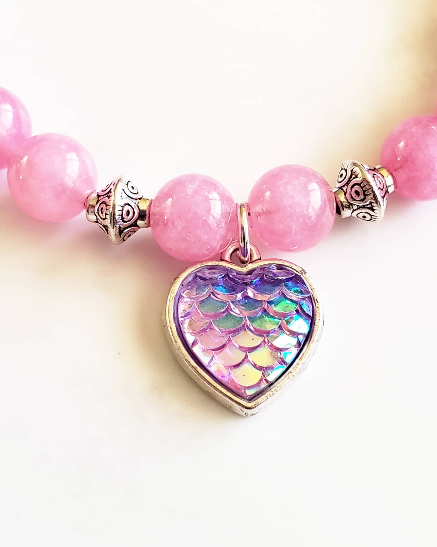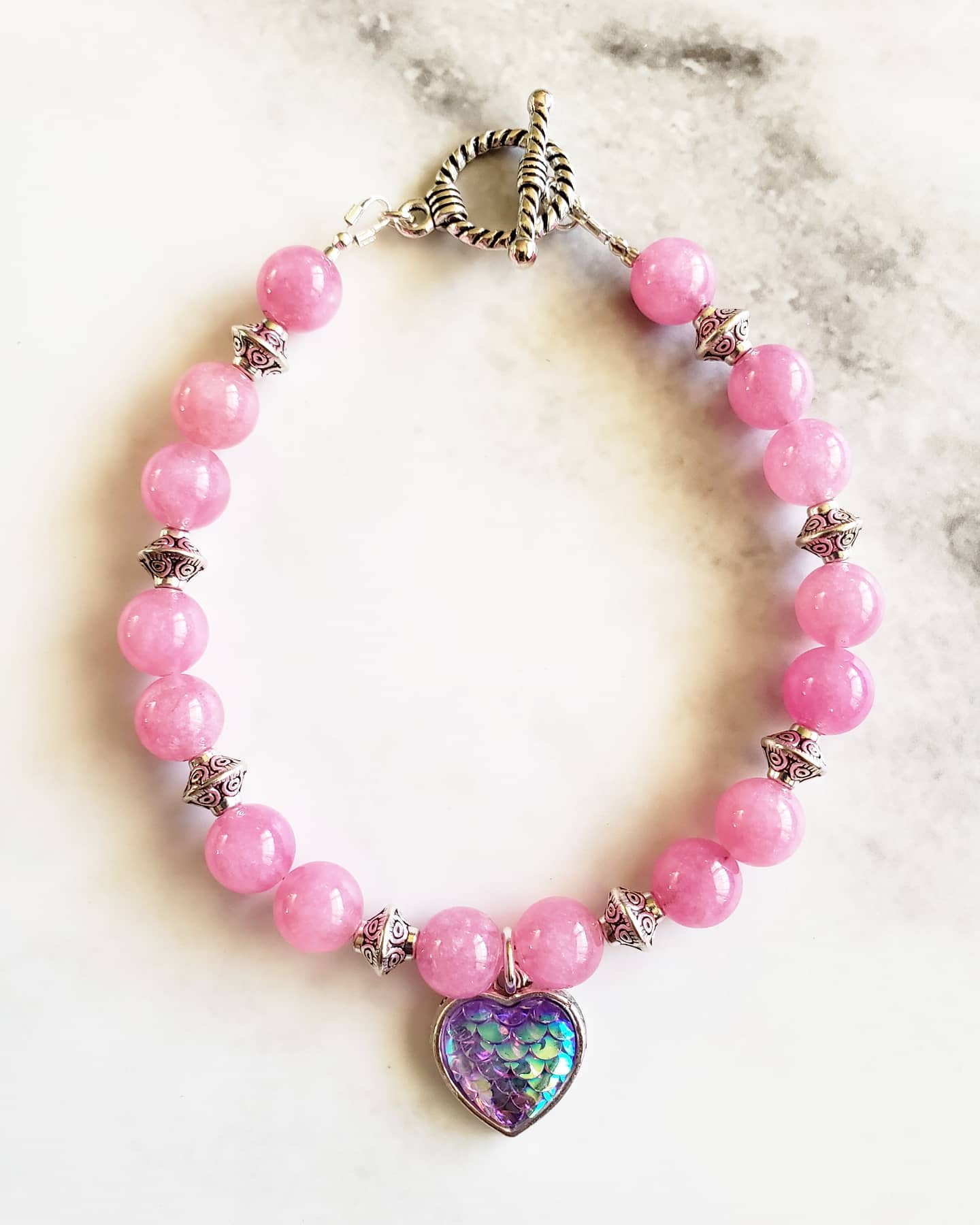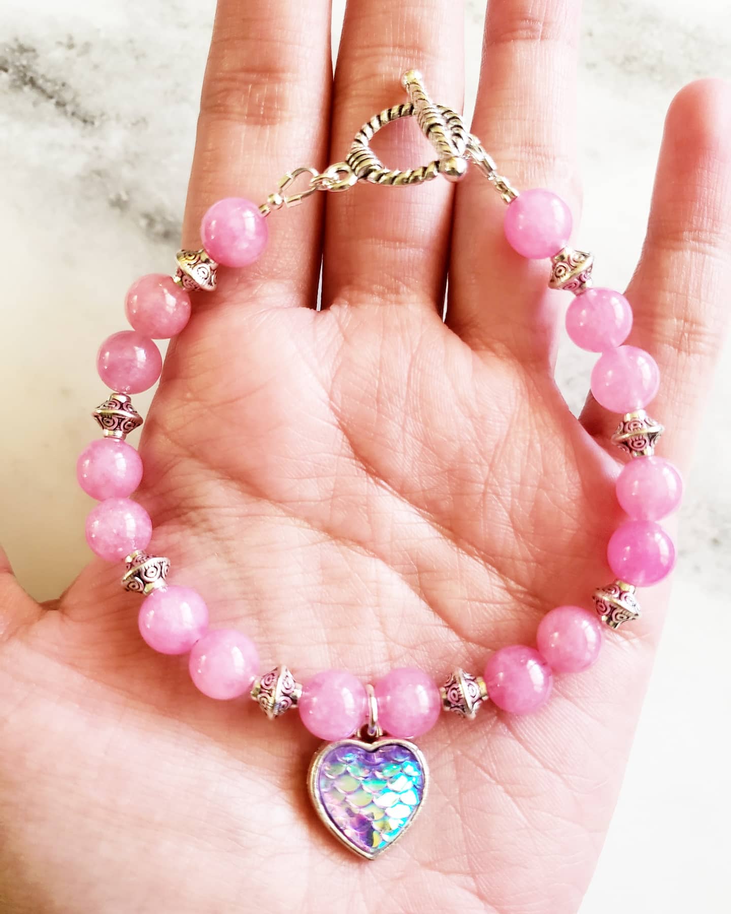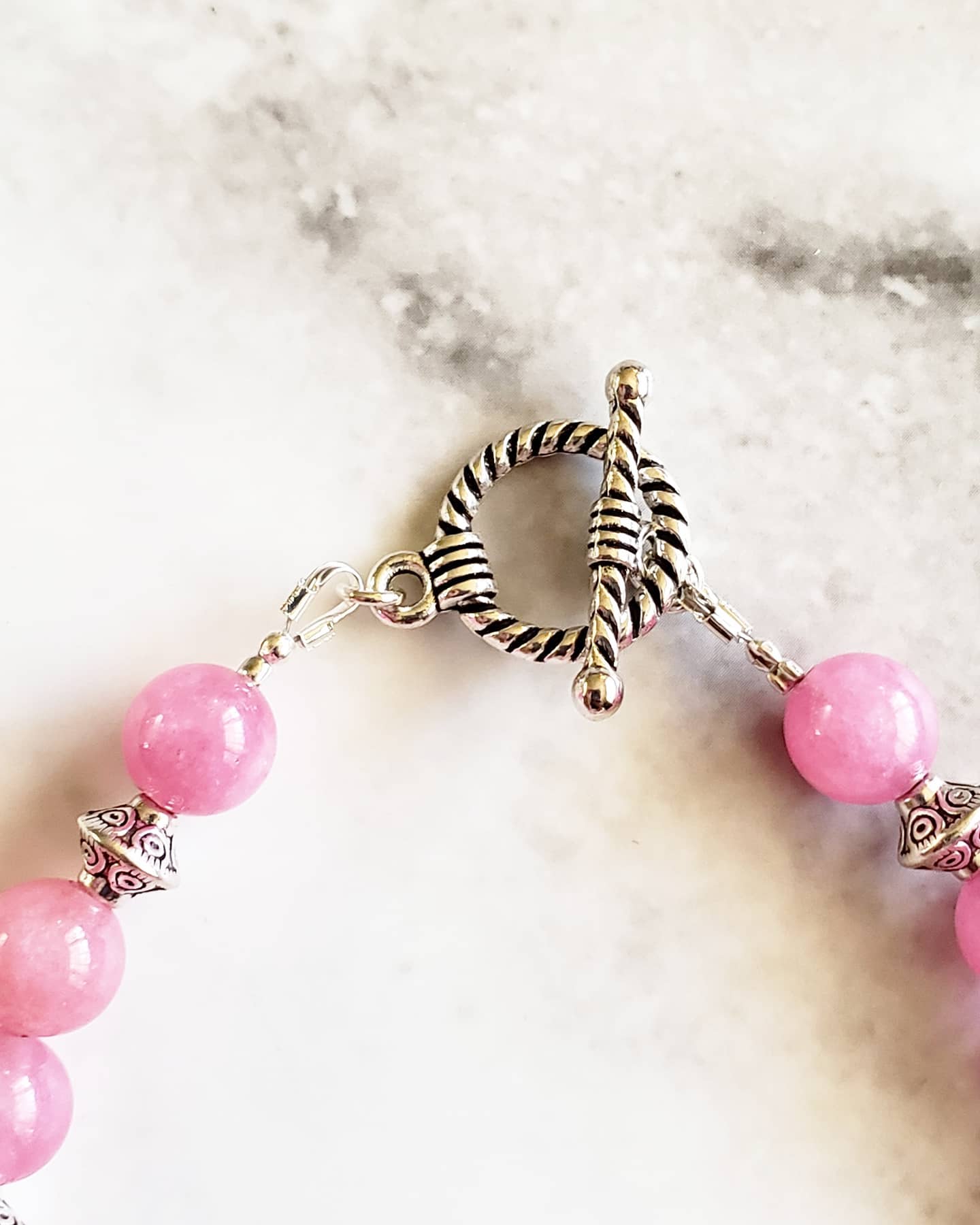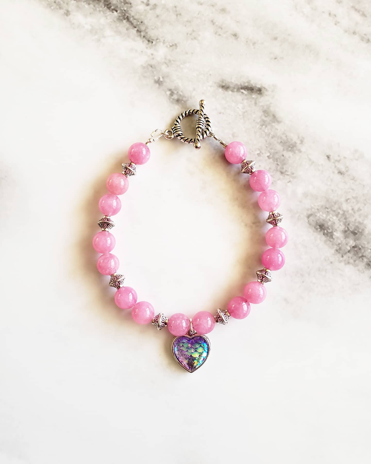 Bracelet Made Of: Light Pink Jade Beads (8 mm), Tibetan Silver Spacer Beads, Toggle Clasp, Unicorn Heart Charm