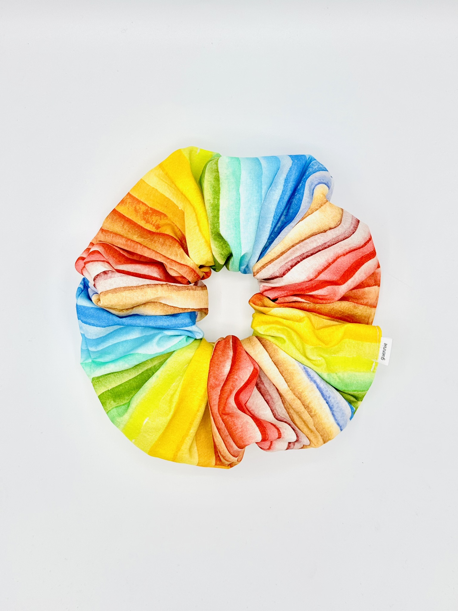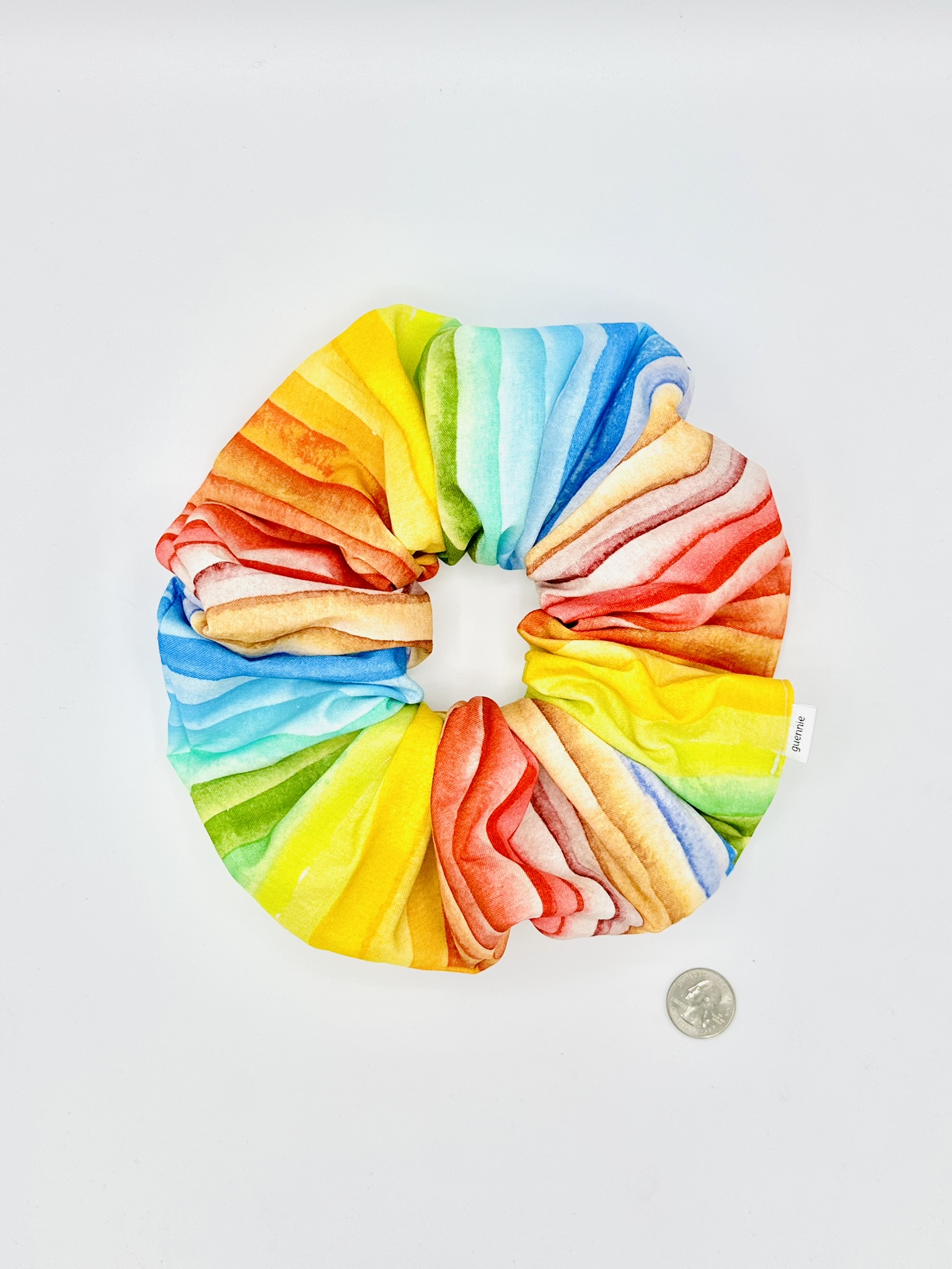 Brighten up your hair game with Vivid, an oversized scrunchie crafted from soft cotton fabric featuring a dazzling tie-dye rainbow print bursting with color. Measuring about 9 inches in diameter, this handmade scrunchie adds a playful, retro flair to any hairstyle while keeping your hair comfortably secure with a durable 3/4 inch wide elastic. Perfect for those who love bold, joyful accessories that turn heads! 🌈🎉🌀